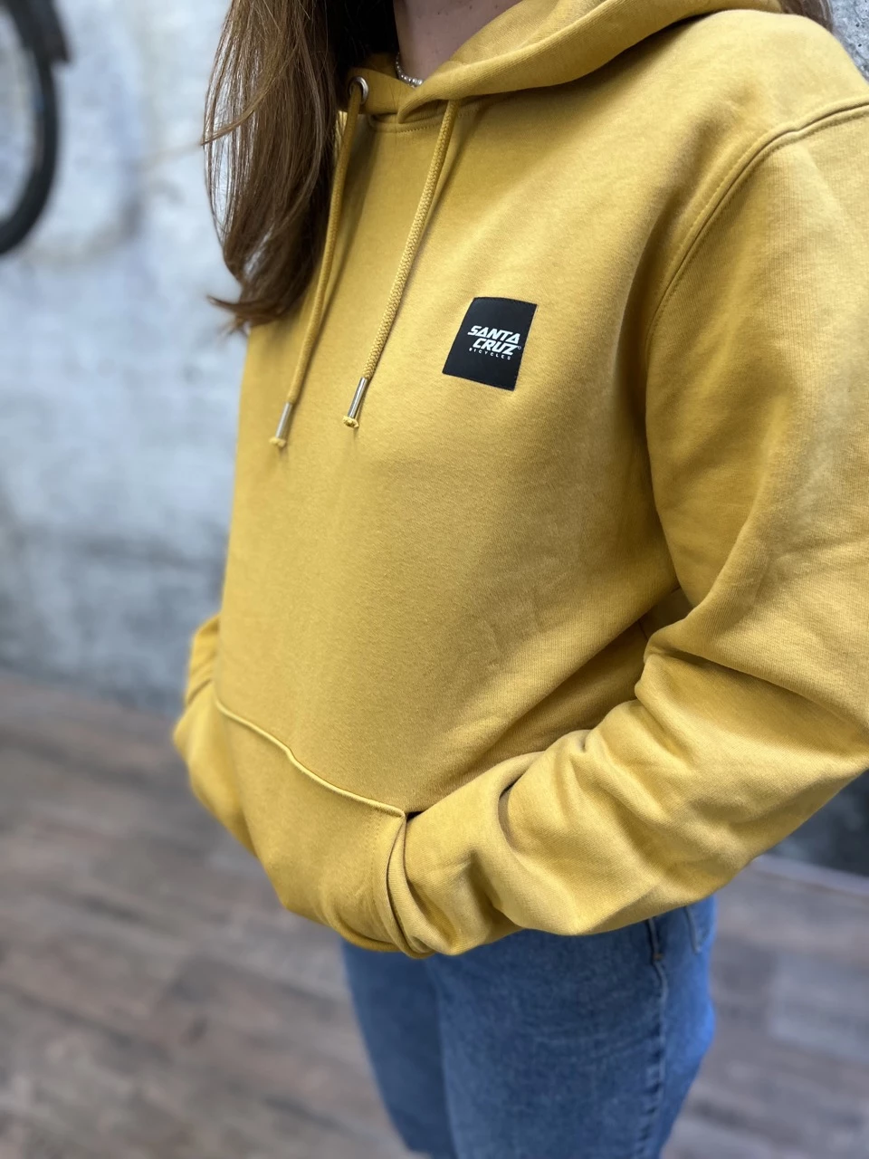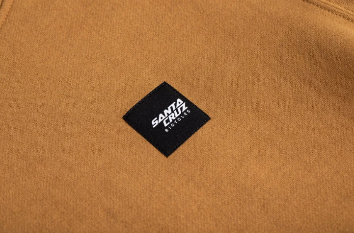 Schöner Santa Cruz Hoodie im Workwear-Stil mit einem gewebten Santa Cruz Bicycles-Label auf der Brust.